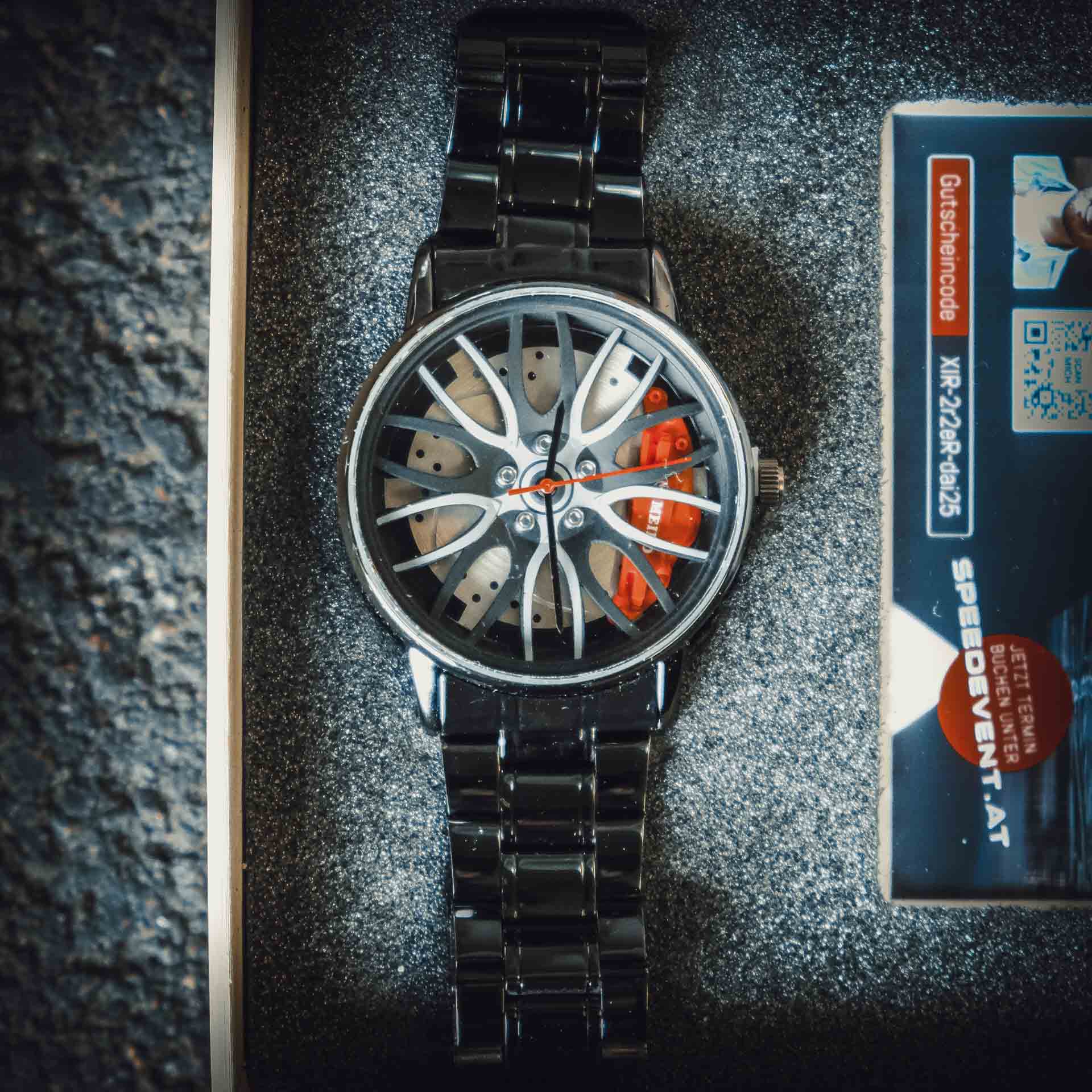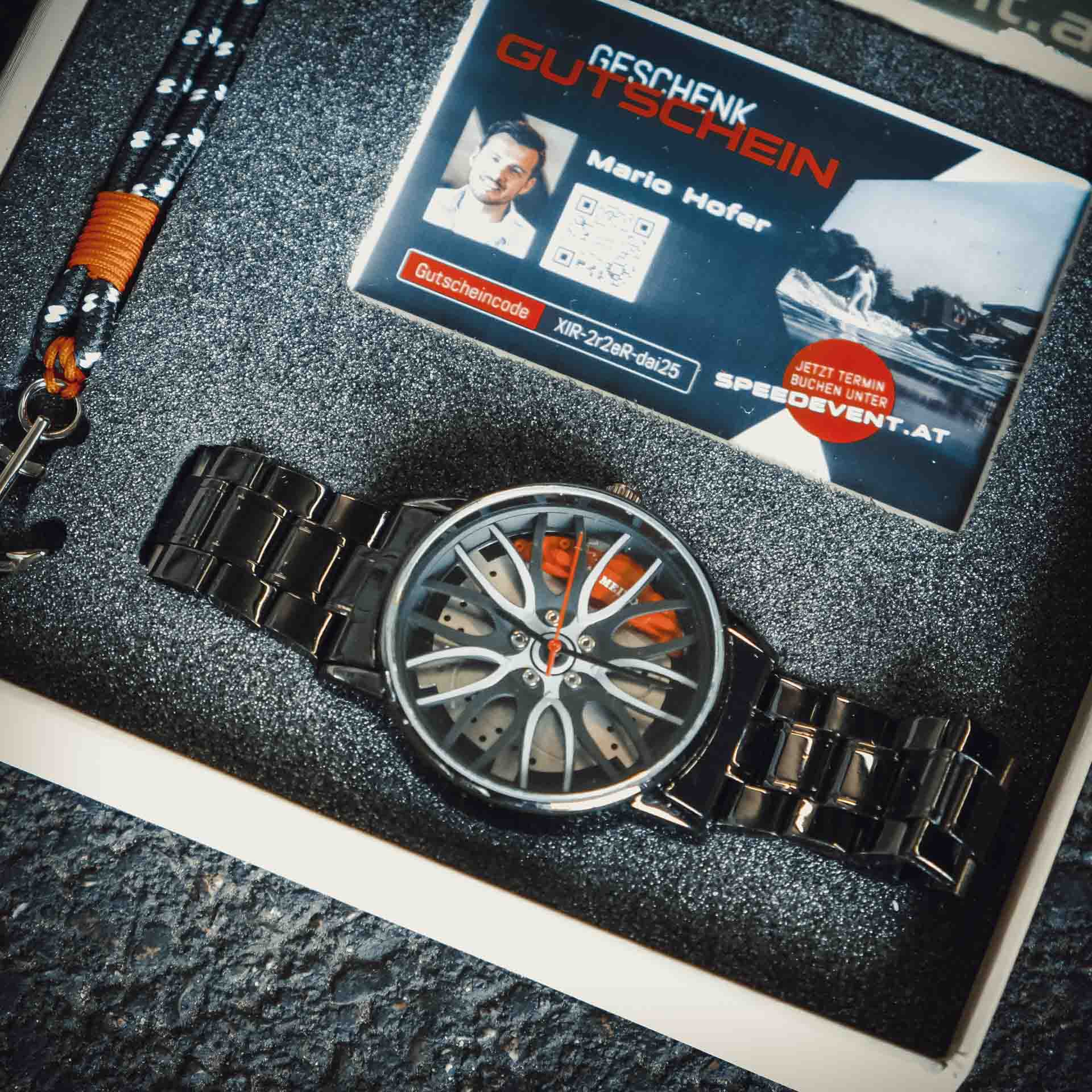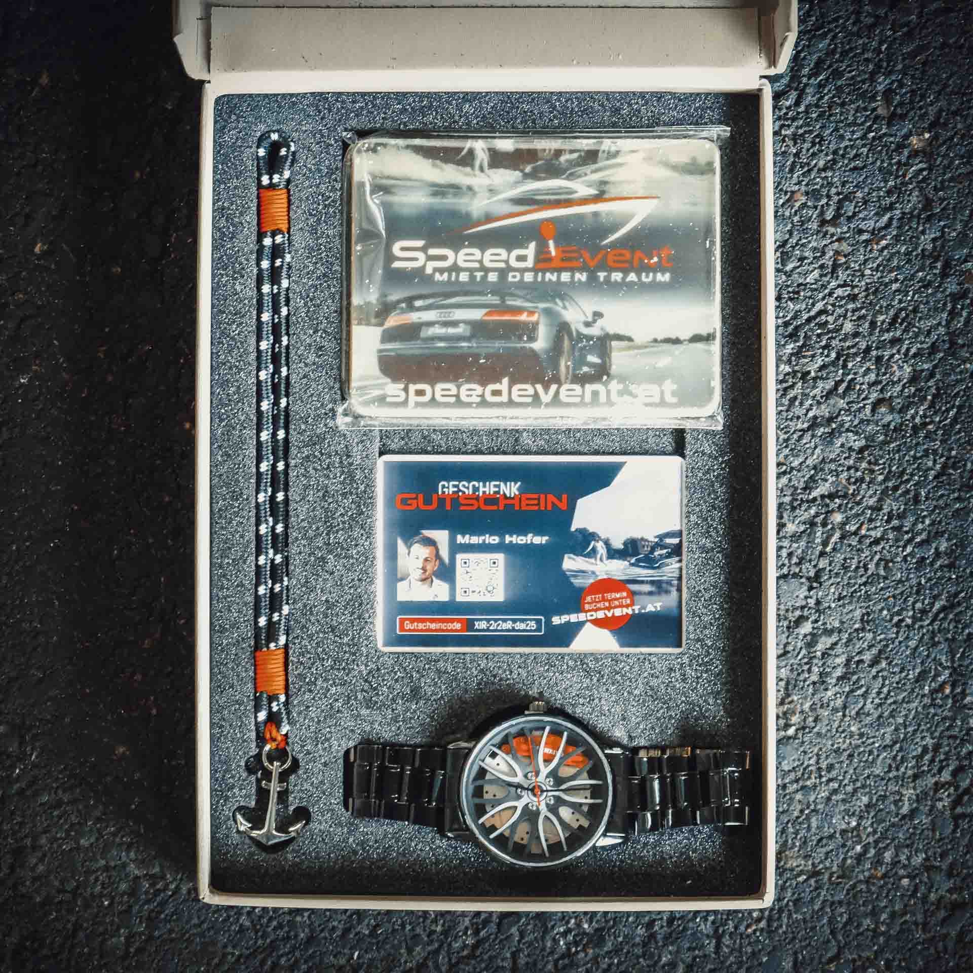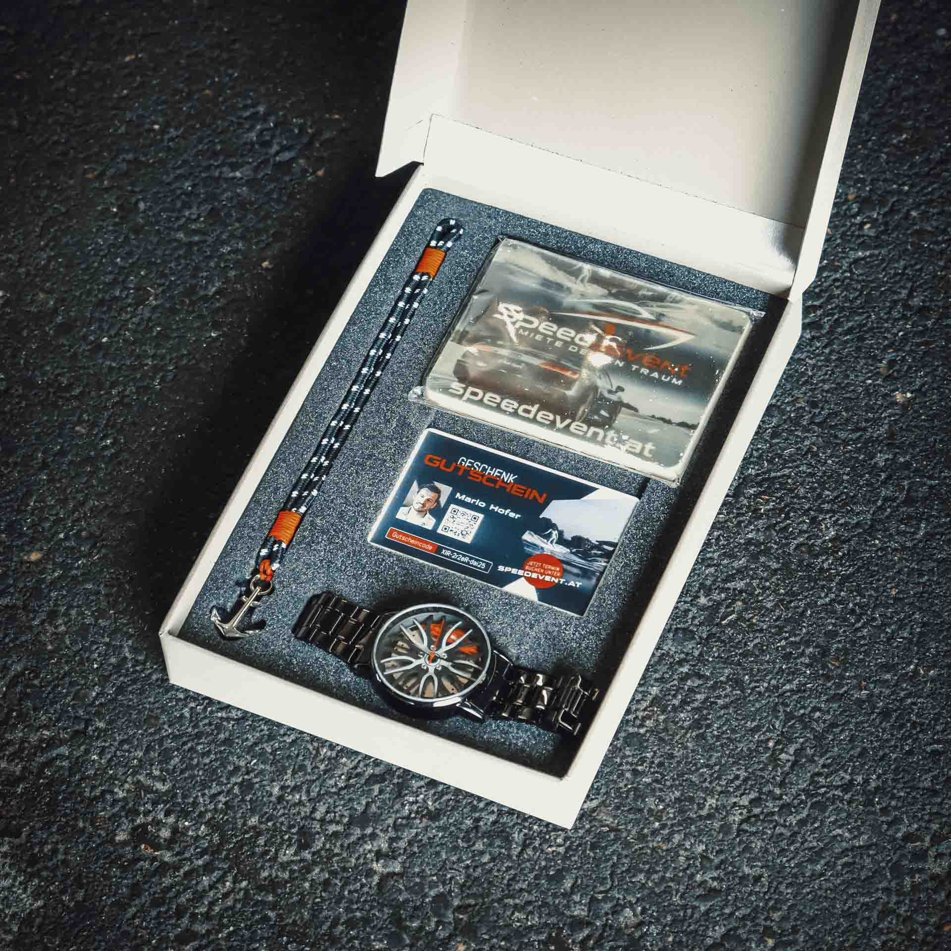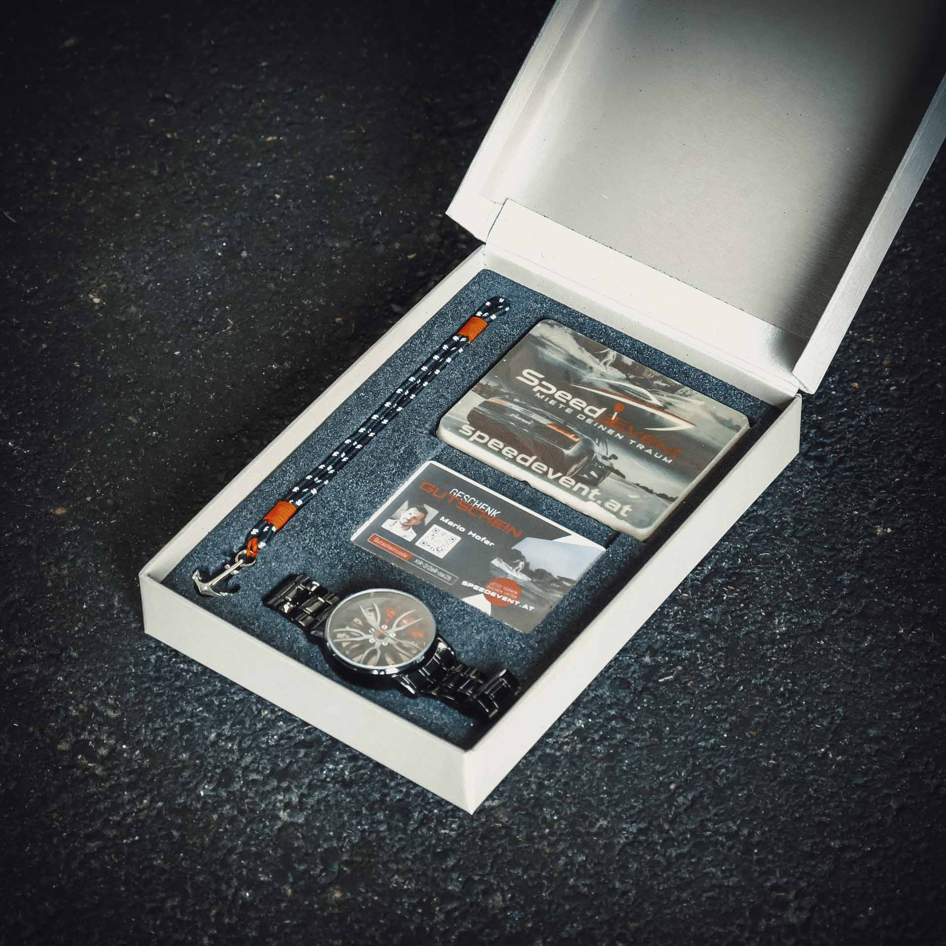 Wähle ganz einfach den Wert der Gutscheinkarte und schenke einen WOW-Moment mit einer Uhr im Autofelgen-Design, einem Anker-Armband und einer köstlichen weißen Schokolade im SpeedEvent-Look. Die Gutscheinkarte kann mit Bild und QR Code bedruckt werden, sodass der/die Beschenkte Augen machen wird. Wir senden die Box versandkostenfrei zum gewünschten Ort zu. Alternativ kann der Gutschein auch als print@home ohne Gutscheinbox zuhause gedruckt werden.